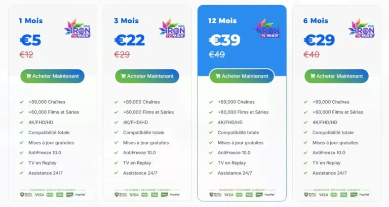 Sélectionnez l’offre Iron TV Pro qui vous convient : 1 mois, 3 mois, 6 mois ou 12 mois. Toutes nos formules offrent un accès complet aux chaînes IPTV, VOD et contenus en qualité HD, Full HD et 4K.
