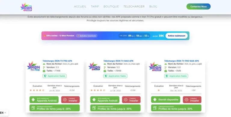 L’application Iron TV Pro APK agit simplement comme un lecteur (player), permettant d’accéder facilement au service. Elle peut être téléchargée librement, tandis que l’accès complet nécessite un abonnement dédié . Celui-ci est proposé à un excellent rapport qualité-prix avec activation rapide par code, offrant en quelques instants une expérience stable, fluide et performante, similaire aux standards proposés par solutions IPTV reconnues .