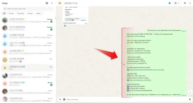 Après validation, vous recevez votre code Iron TV Pro officiel (Active Code, Xtream Codes, M3U ou MAG) directement par email ou WhatsApp, en quelques minutes seulement.